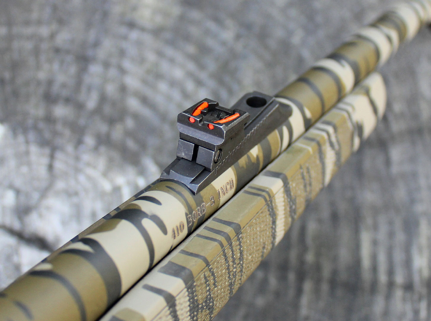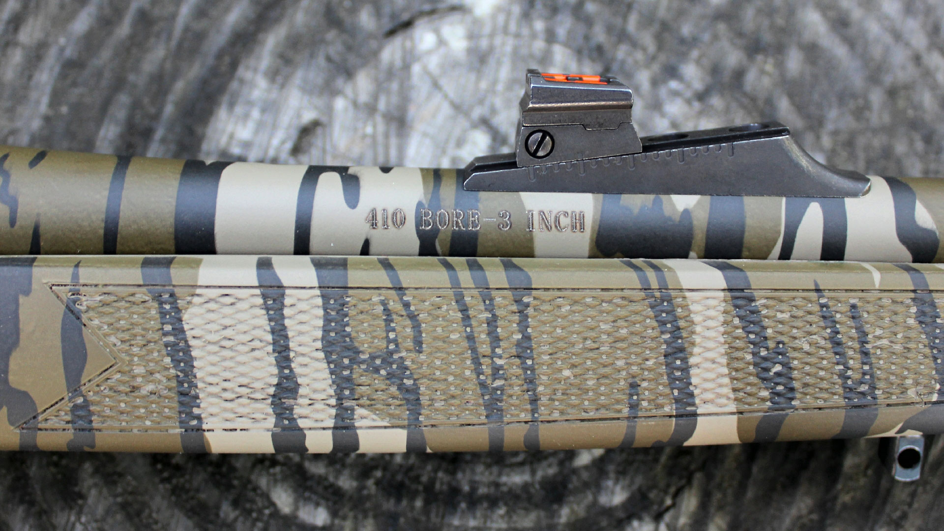 Manufactured here in the United States at Henry's Rice Lake, Wisconsin, facility, this turkey gun is a variation of the company's H015-410 break-action .410-bore single-shot that is built around a steel receiver. The most notable difference is the turkey version's total coverage in a Mossy Oak Obsession camouflage finish. The blued-steel appointments and the soft rubber recoil pad blend right in.