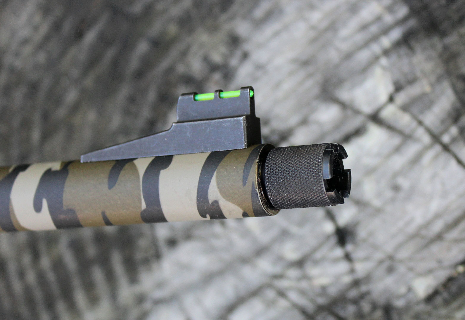 The bright green fiber-optic front sight rests over the extended removable Turkey choke tube.