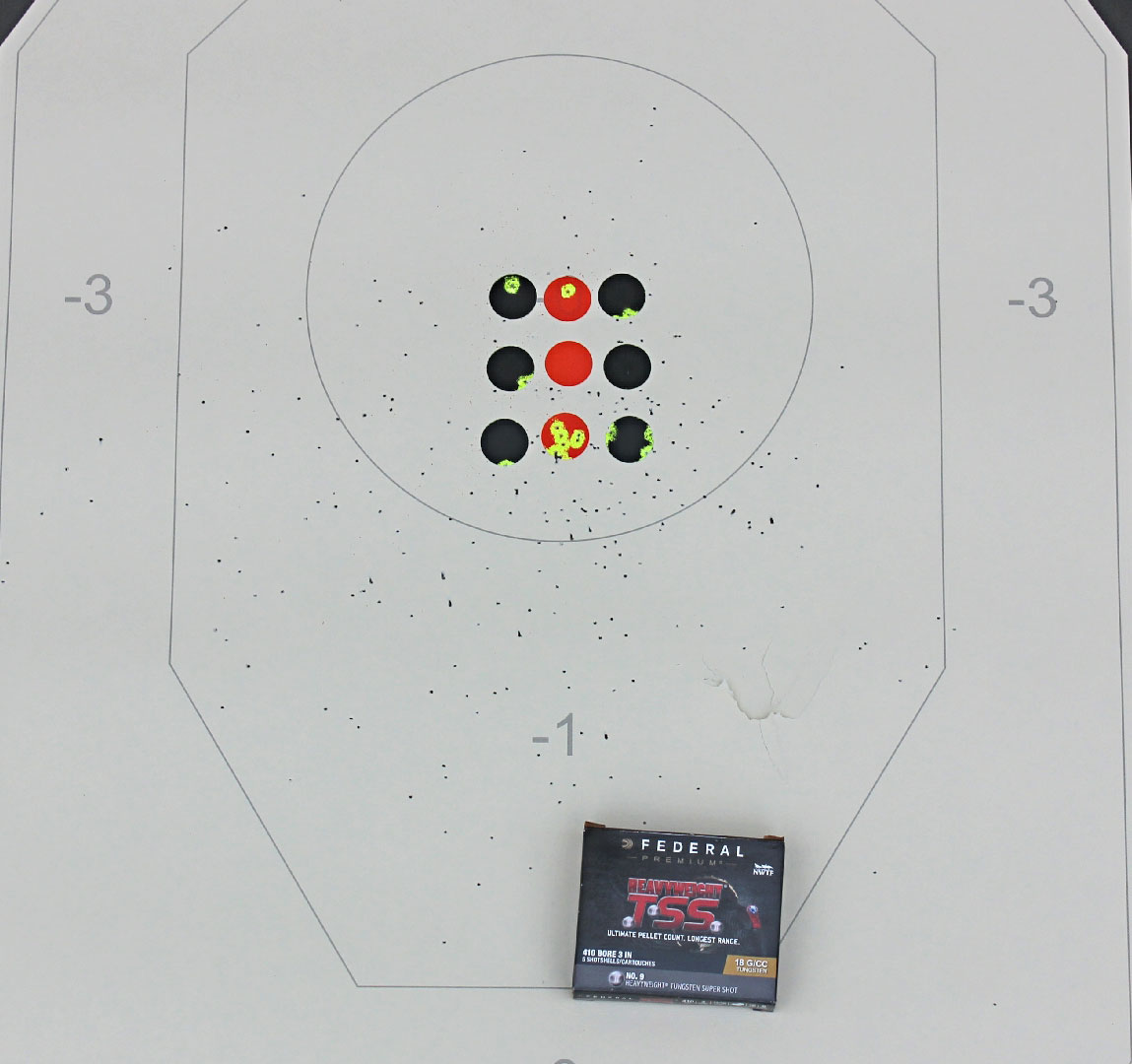 The last round of the test was the Federal TSS load with its 13⁄16 oz. of buffered #9 dense tungsten pellets traveling at 1100 f.p.s. Of the 285 pellets, a total of 188 passed through the central circle, or it patterned with about a 66 percent strike rate. Yep, that ought to do the trick!