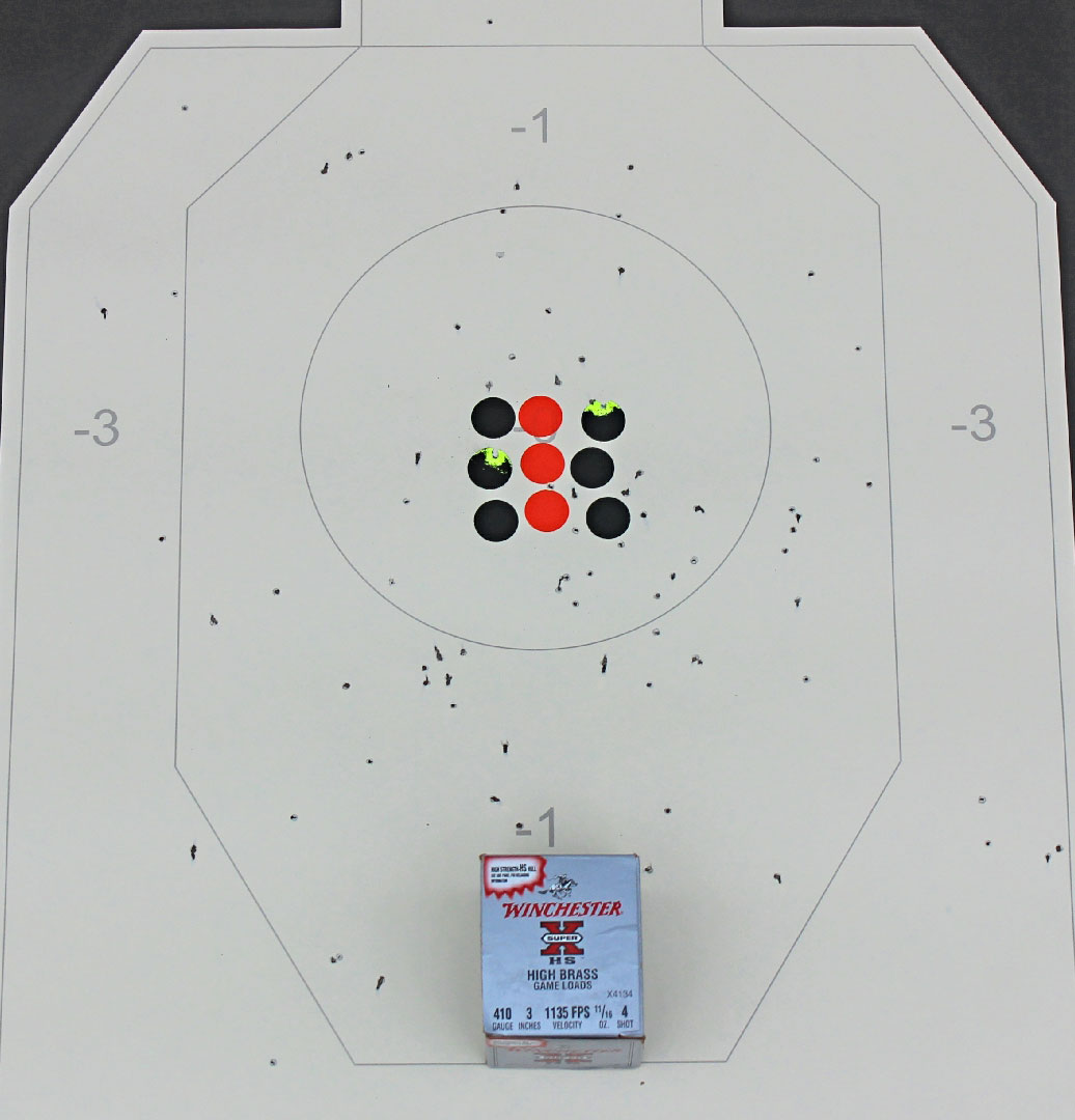 But what about shot-pellet pattern density? The .410 cartridge contains relatively small payloads of birdshot, especially when compared to larger gauges. As for the turkey, its head is roughly 2" wide and 3" long with a neck that's also 2" wide and around 8" long. If you draw an 8" circle with the turkey's eye at the top and the turkey's body at the bottom, the center of the circle is where hunters are looking for a dense pattern of shot pellets to affect a quick and ethical kill.