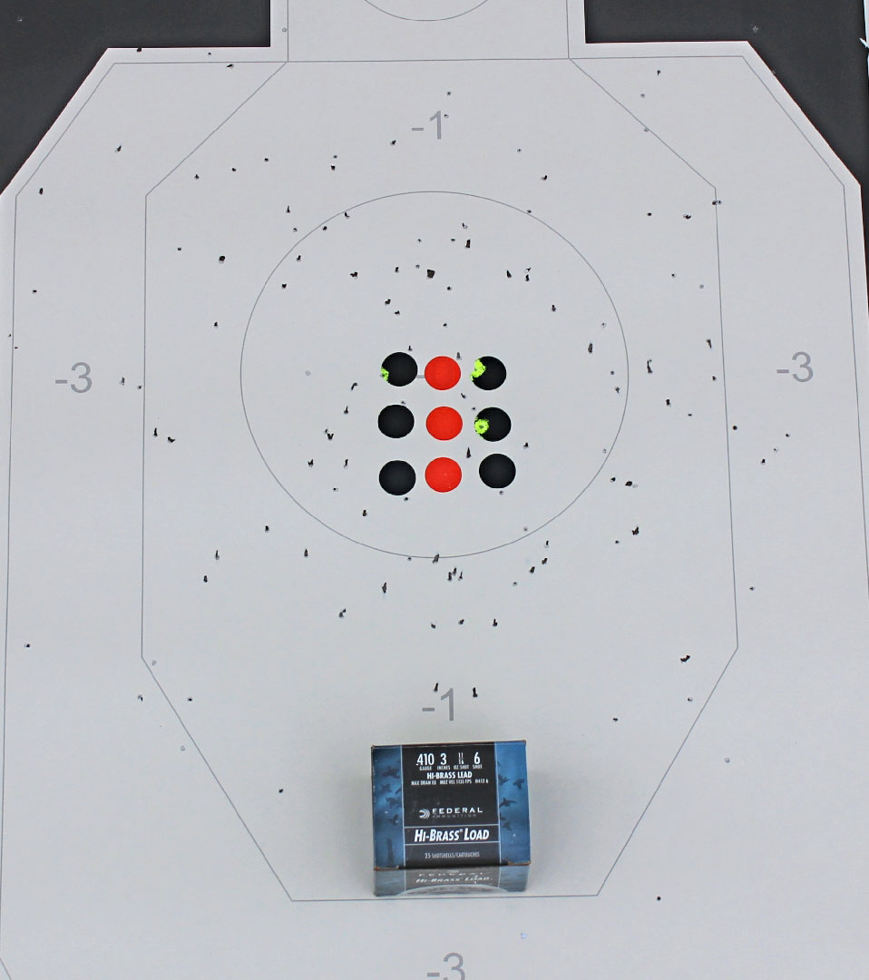 The first cartridge tested was Federal's Hi-Brass 3" shell loaded with 11/16 oz. of #6 lead birdshot at a listed velocity of 1135 f.p.s. In this case, there were 46 of this shell's 143 lead pellets inside the circle for about a 32 percent strike rate.