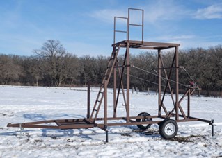 We have a Hawk blind on a Keene Outdoors portable hunting platform that pulls behind our truck. Once in the field it gets cranked up, and we have a perfect blind with a floor height at 10-feet tall. If the deer move, we can move without a big hassle. This has made our late-season hunting both more effective and more fun, so we can take the entire family and keep everyone warm while watching all the deer in front of us!