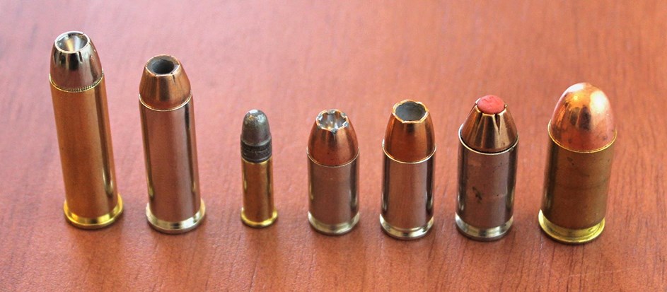 From left: .357 Mag., .38 Spl., .22, ,.380 ACP, 9 mm, .40 S&W, .45 ACP