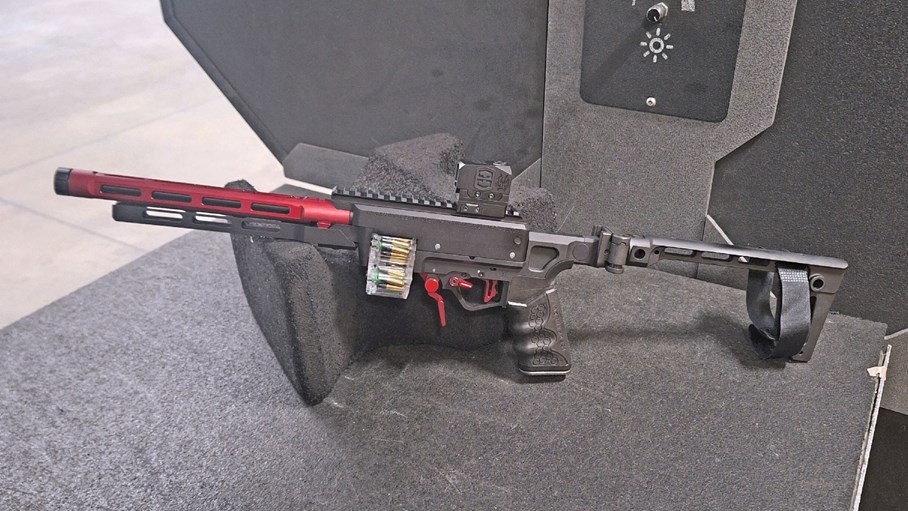 When fully assembled, the Comet pistol tipped the scales at 2 lbs. 12.8 oz. with an empty magazine before attaching the brace and optic. The fit and finish was top shelf throughout. The red barrel shroud V block, extended bolt catch, bi-directional Fireswitch magazine release lever, ambidextrous safety levers and flat-faced trigger provide a handsome contrast to the matte black finish of the rest of the gun. The trigger of the adjustable Ultimate Trigger Kit, sporting a flat-faced Victory trigger shoe, arrived tuned to a 2 lbs. 14 oz. trigger pull. It exhibited a crisp, clean break after just an eighth of an inch of travel.