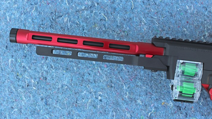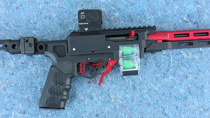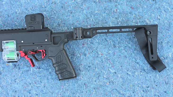 TK's Manticore X “lower” simplifies the 10/22 part selection and assembly process a good deal. This is because it's fully outfitted with hardcoat anodized, competition-style controls at the factory. The CNC-machined aluminum chassis houses the trigger group with extensions and modifications that eliminate the need for a shoulder stock by holding the action together and providing a magazine well. The housing is designed to be used with a removable AR-15 style pistol grip. At the rear of the Manticore X is an extension that supports a short Picatinny rail for attaching fixed or folding stabilizing pistol braces. The Manticore X ships with a set of ball detent cross pins, to secure it to the receiver, and a rubber Shock Block bolt buffer.
