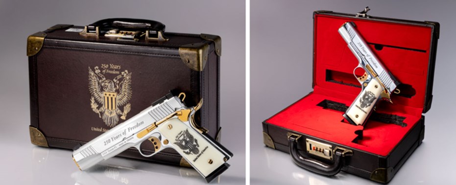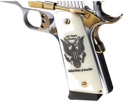 This commemorative 1911 features laser engraved grips with a rendition of the Great Seal of the United States, an engraved slide with chrome finish, and PVD gold accent controls. Dressed for the occasion, each pistol stands out with its striking finish and the timeless appeal of the 1911 platform.