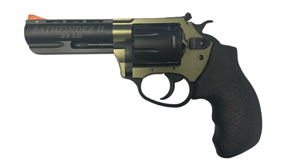 Near the end of 2025, Charter Arms released two new 8-shot .22 LR revolvers. The Pathfinder II has a 3.5" vented rib barrel with a bright orange front sight and an adjustable square notch rear sight. The stainless steel barrel and cylinder are supported by an anodized aluminum frame for an unloaded weight of 20 ounces. The pebbled black rubber grip is just long enough to support all three fingers of the shooting hand. The finish options for this series include stainless steel (silver), matte black or black with an OD green frame (shown). MSRP $510.61