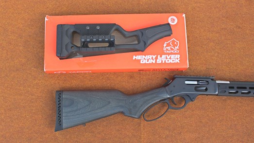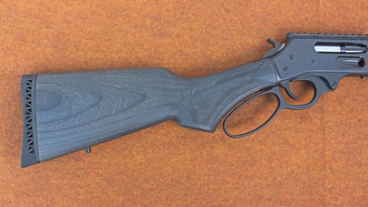 In place of an X Model style polymer stock, or a skeletonized aluminum stock, Henry opted to outfit this gun with a hollow laminated American hardwood shoulder stock that provides a 14" length-of-pull (LOP). It sports a checkered pistol grip, a vented rubber recoil pad, a sling swivel stud and a gray, water-resistant finish similar to that seen on the All Weather model stocks.