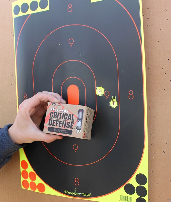 The Taurus Judge has been popular enough that ammunition makers have developed .410 shells specifically for this platform. A common feature of these specialized rounds is mixed payloads, meaning, different types of projectiles fired at the same time. Hornady offers the 2.5" long Critical Defense Triple Threat load which contains a single .41-cal. 115-gr. FTX lead slug at the front with two .35-cal. lead balls weighing in at 65 grains each tucked in behind it. In this case, the three projectiles and the wad flew close together to form a 1.49" pattern with just two impacts to the target.