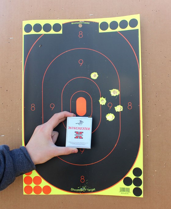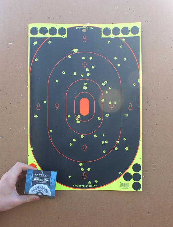 I rustled up an old box of Federal Premium 3" Hi Brass Game Shok (H4136) which launches 11/16-oz., or about 155 pellets, of #6 lead birdshot. Although the pattern covered the target, the pellets spread much more quickly at this distance than the #9 shot. So of the two, the Winchester shell with the finer shot would be the better option for pests using this gun.