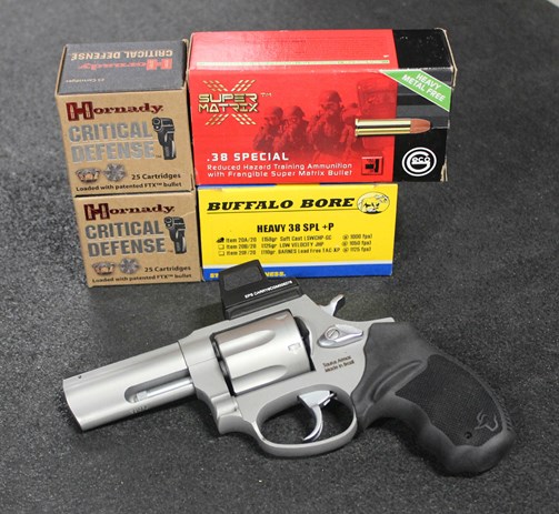 The .38 Spl. ammunition tested included loads ranging from practice-grade to +P rated premium defensive rounds. The three loads use for formal accuracy testing included a hard hitting soft lead hollow point from Buffalo Bore Ammunition, a sintered no lead frangible practice load from Geco and a low-recoil FTX round from Hornady. With all three loads the EPS optic contributed to tighter group sizes fired from a bench rest at 7 yards: