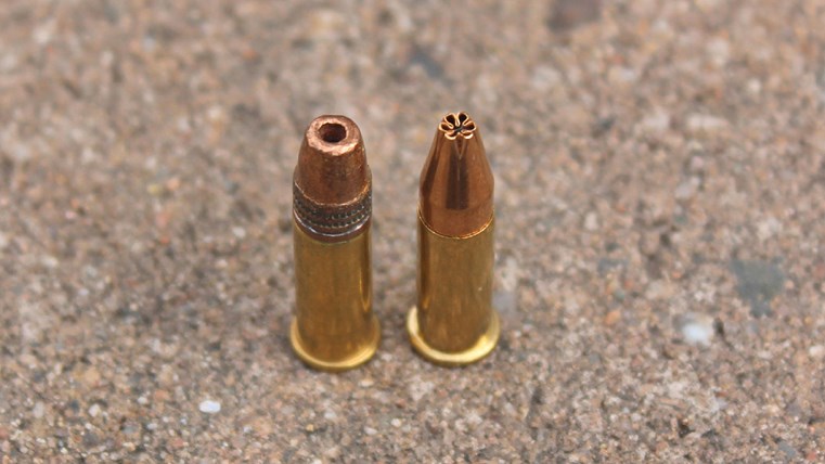 A .22 LR copper-plated lead hollow point (left) compared to a .21 Sharp jacketed hollow point (right).