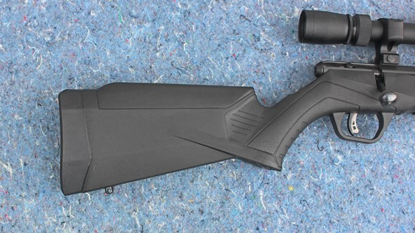 The rifle arrives topped off with a set of iron sights consisting of a post front and a fully adjustable V-notch rear. Savage thoughtfully includes a pair of scope bases, which are installed at the factory, that do not block the view of the iron sights. The bolt assembly is outfitted with a knurled bolt handle knob and a cocked striker indicator which is visible just above the tang mounted safety slider.